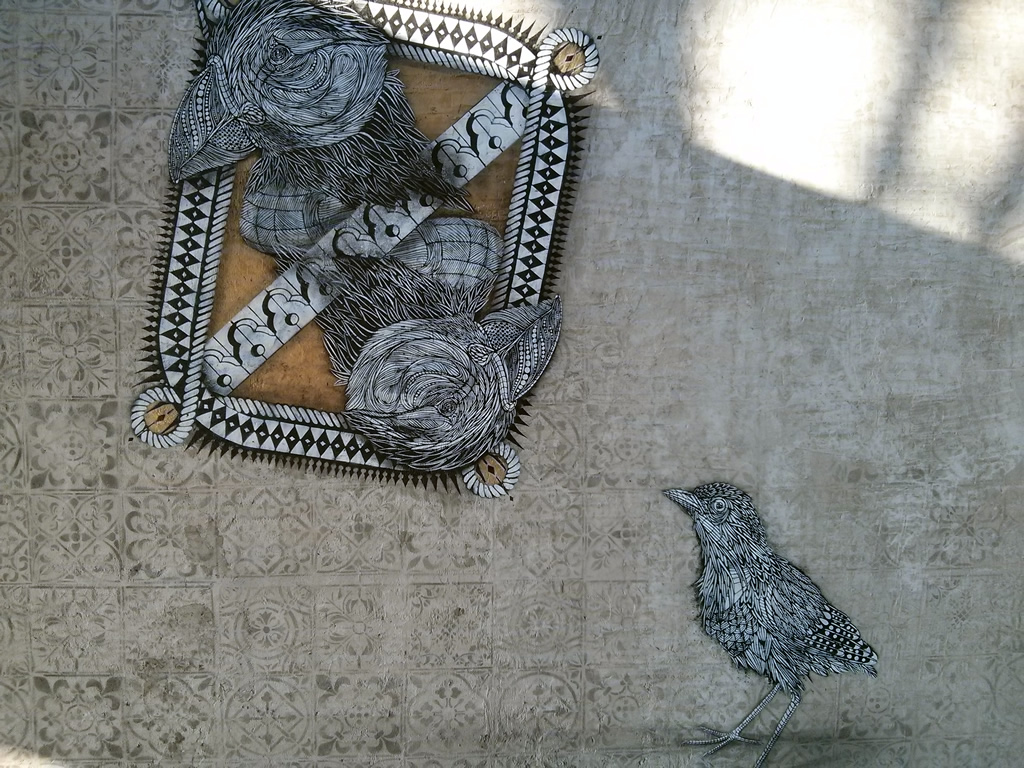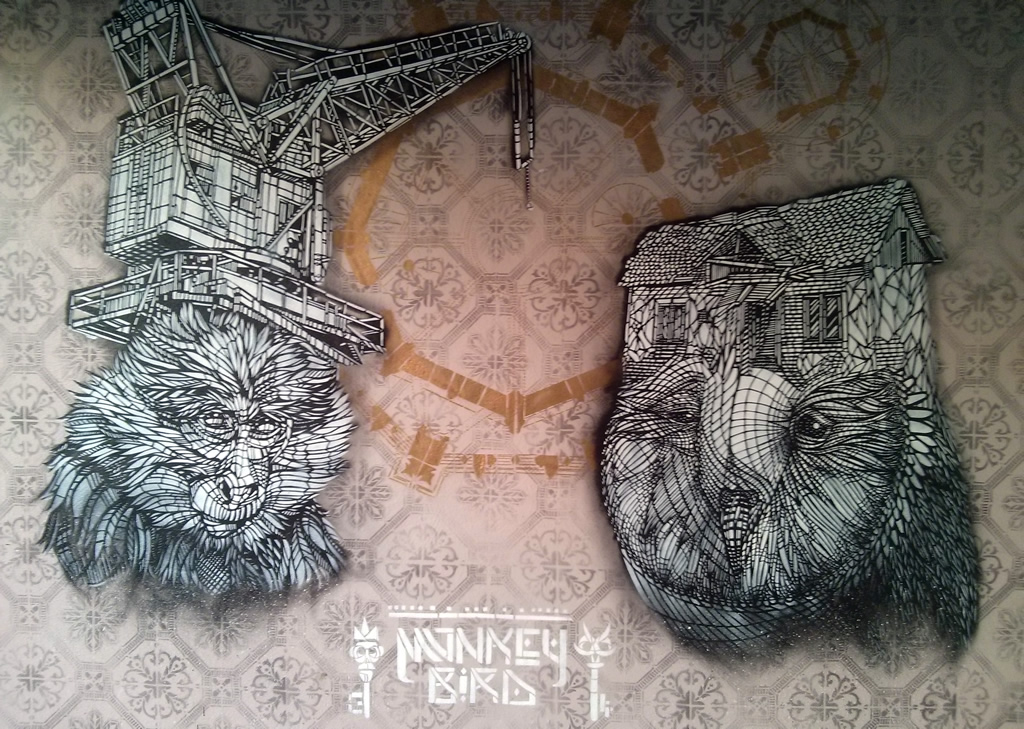 Si l’université Bordeaux Montaigne peut paraitre un peu vieillissante, notamment à l’intérieur de ses locaux, elle reste une faculté avec de nombreuses sections artistiques. Monkey Bird Crew (des virtuoses du pochoir dont on a déjà parlé sur fairelemur.com) ont été invités pour faire des créations à l’arrière des bâtiments. Le crew a fait un bonne vingtaines de tableaux/pochoirs à plumes et à poil avec une occupation intéressante de l’espace et une insertion remarquable dans l’architecture de l’université.